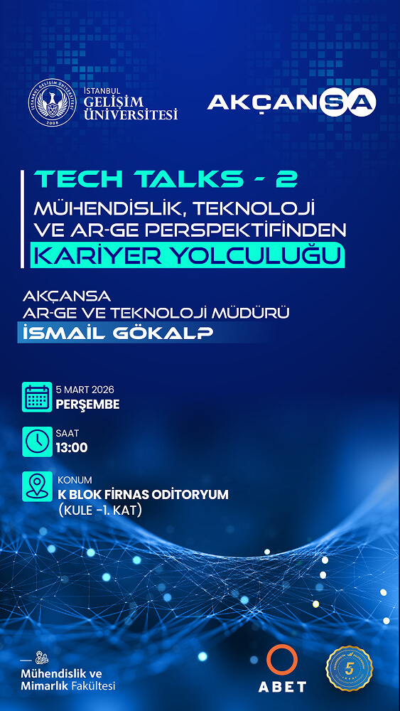 You are invited to Tech Talks-2, the second seminar in the series organized by the Faculty of Engineering and Architecture. The seminar titled “Mühendislik Teknoloji ve AR-GE Perspektifinden Kariyer Yolculuğu”, which will take place on Thursday, March 5, 2026, at 13:00, will feature İsmail GÖKALP, R&D and Technology Manager at Akçansa, as the guest speaker. The seminar will address engineering, technology, and R&D focused career pathways, evolving competency expectations in the industry, and the roles engineers undertake within the innovation ecosystem.