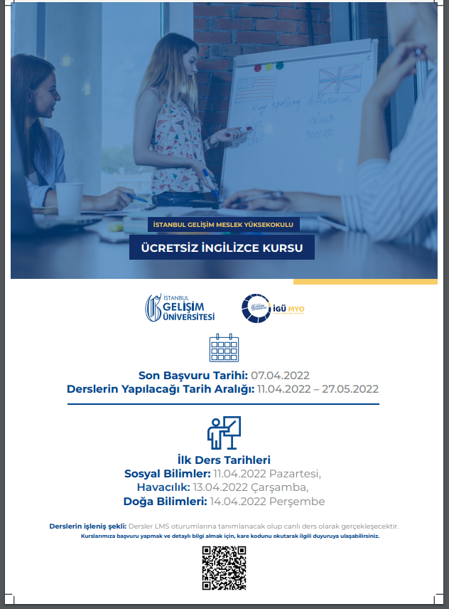 İstanbul Gelişim Meslek Yüksekokulu tarafından İngilizce kursları açılmıştır. Nisan ayının ikinci haftası itibarıyla başlaması planlanan kurslarda; sosyal bilimler ve doğa bilimlerini esas alan bir eğitim amaçlanmaktadır. Kurslara katılım tamamen ücretsizdir.