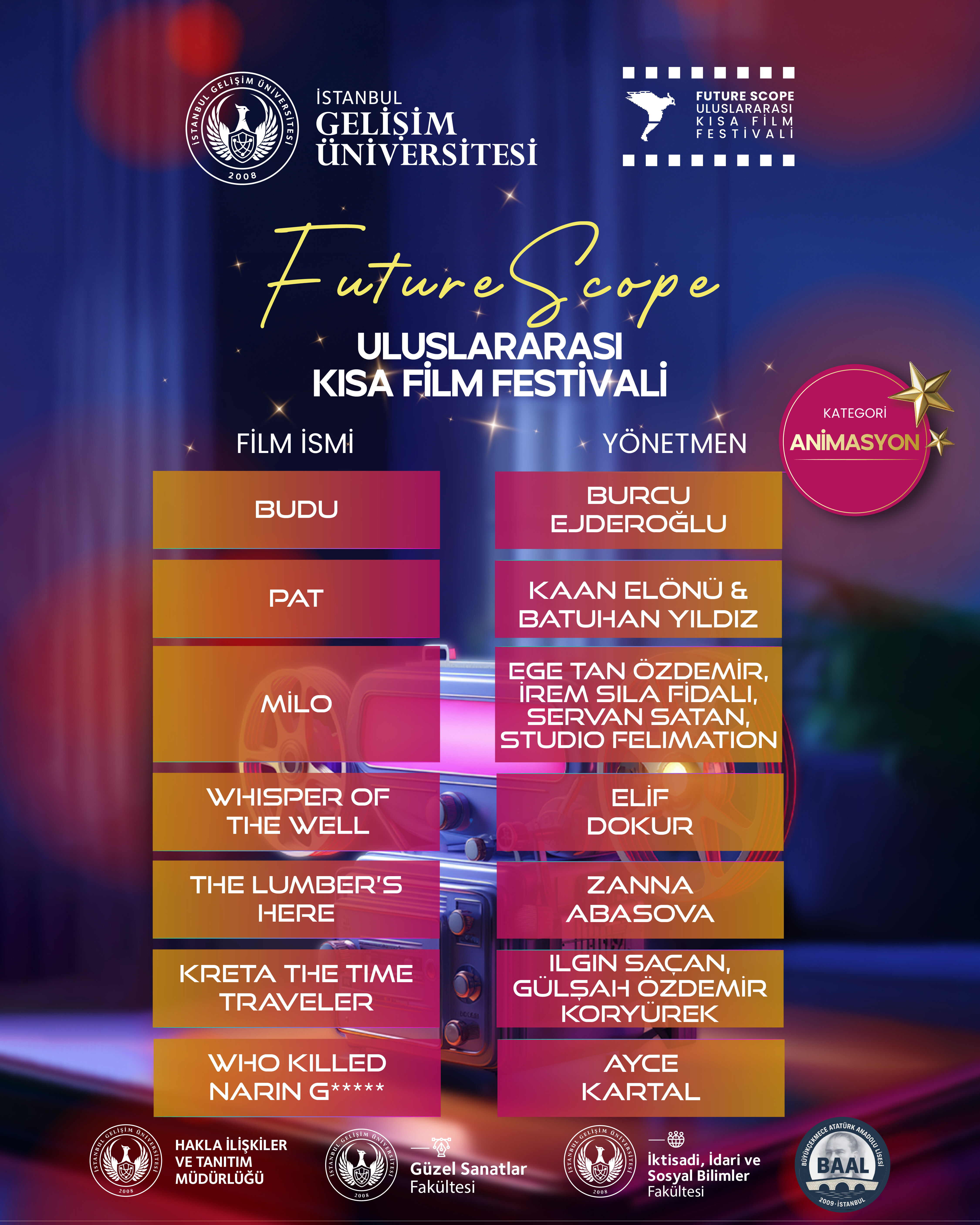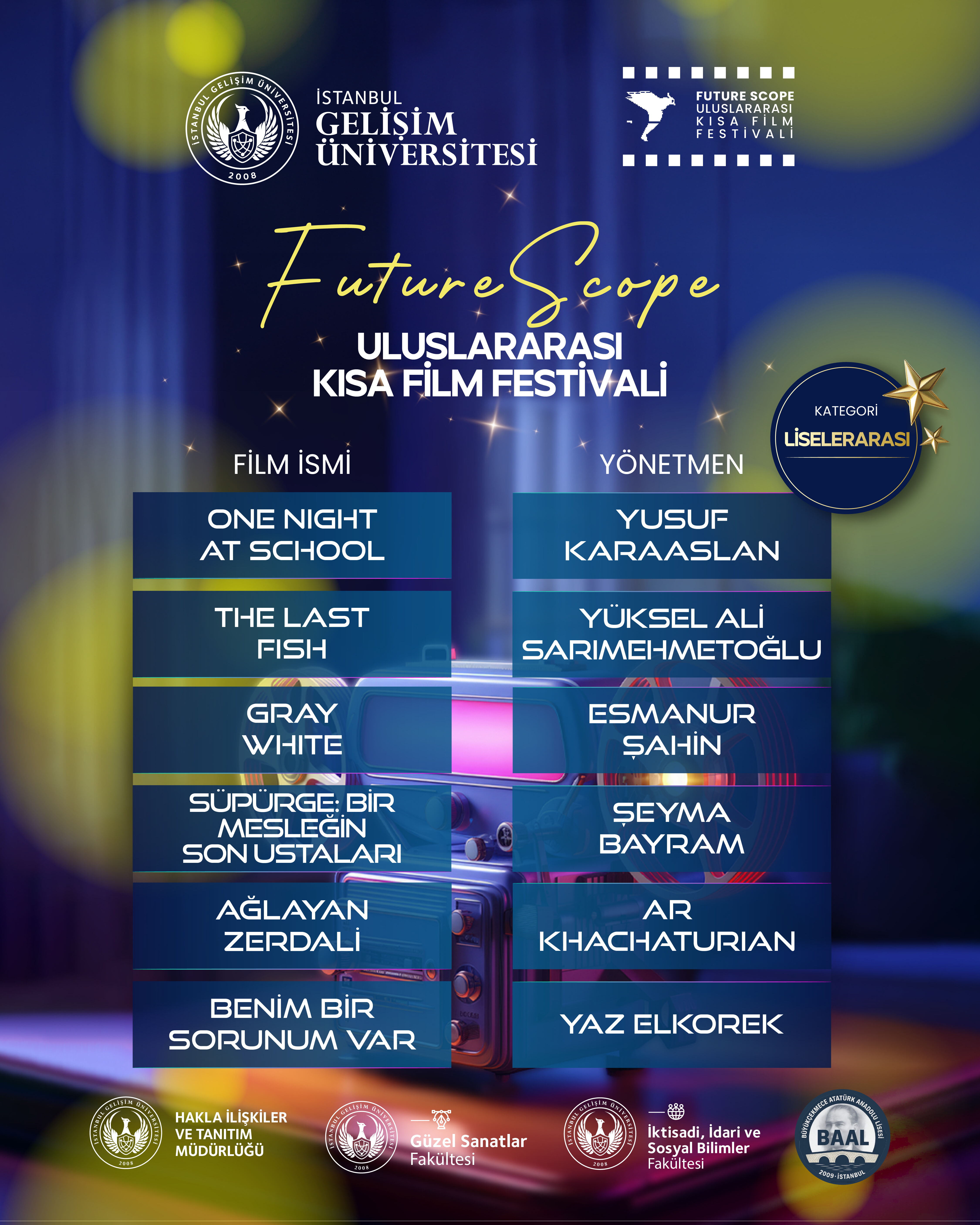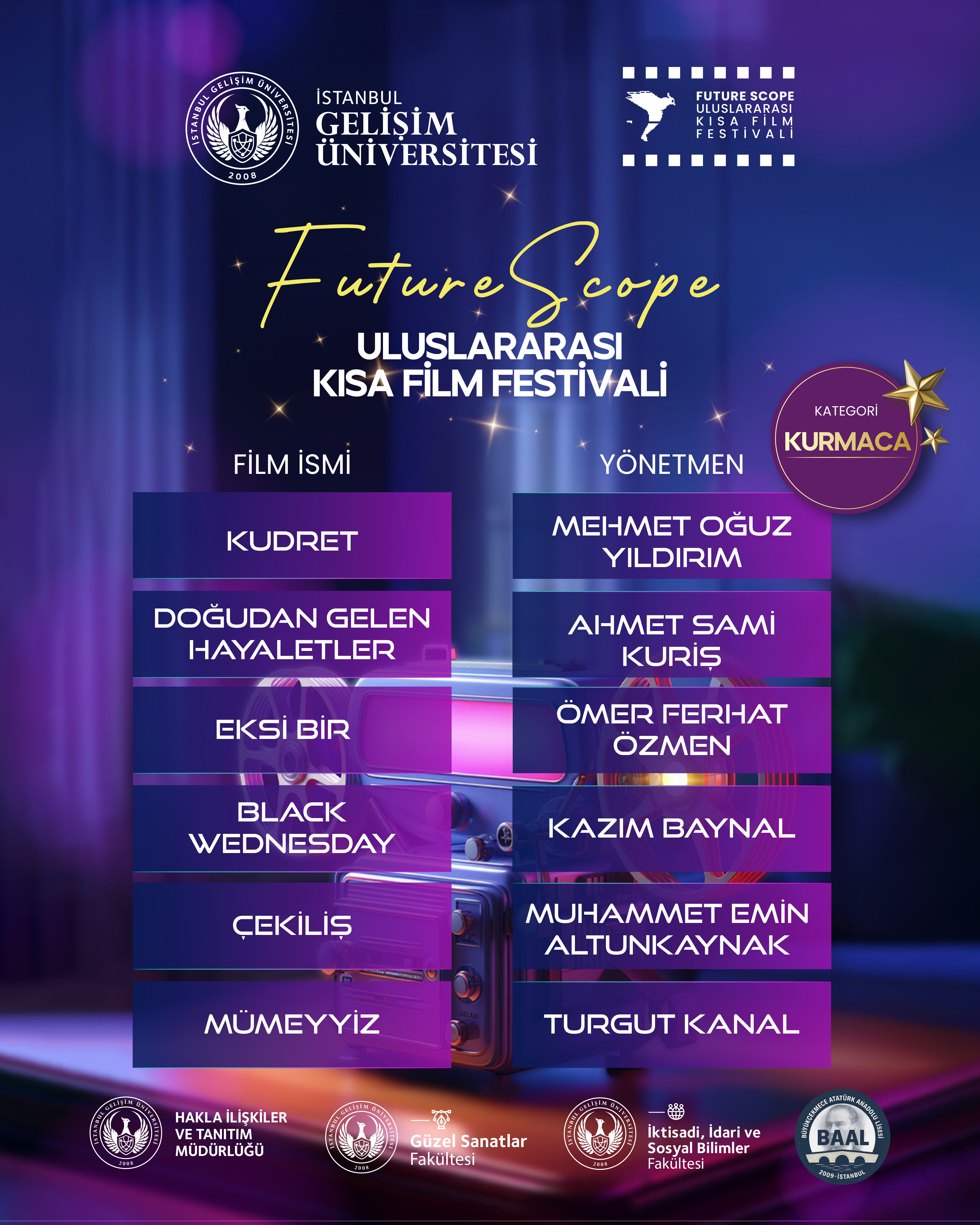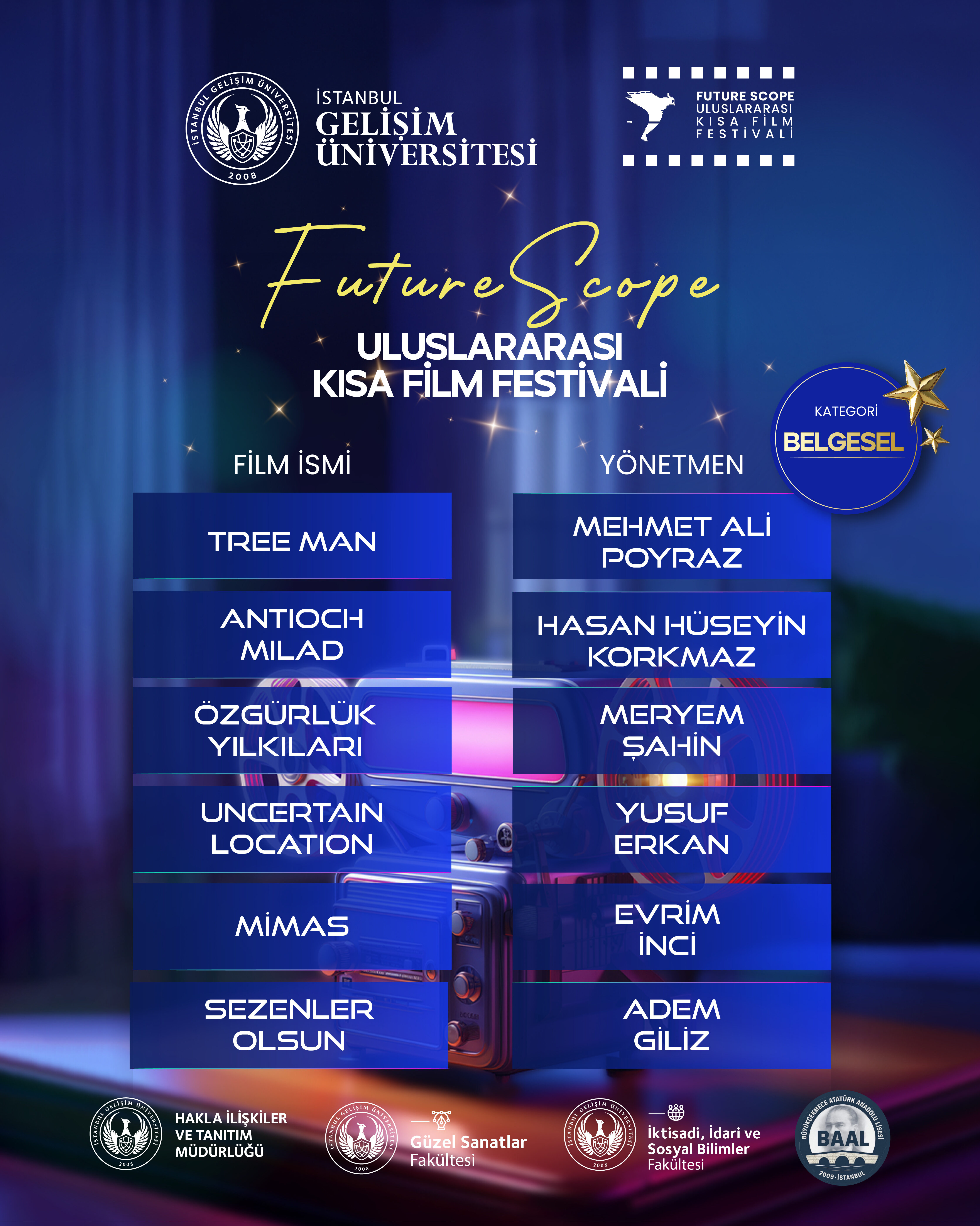 İstanbul Gelişim Üniversitesi tarafından, Halkla İlişkiler ve Tanıtım Daire Başkanlığı ile Güzel Sanatlar Fakültesi iş birliğiyle bu yıl ikincisi düzenlenen FutureScope – Uluslararası Kısa Film Festivali’nin finalistleri belli oldu. Sinemanın dönüştürücü gücünü gençlerin yenilikçi vizyonuyla buluşturan festival, bu yıl da yoğun ilgi gördü. “FutureScope” temasıyla gerçekleştirilen festivalde tüm filmler, Birleşmiş Milletler’in 17 Sürdürülebilir Kalkınma Amacı çerçevesinde değerlendirildi. Kurmaca, belgesel, animasyon ve liselerarası kategorilerde seçilen finalistler, 5–6 Aralık 2025 tarihlerinde düzenlenecek gala ve ödül töreninde izleyiciyle buluşacak.