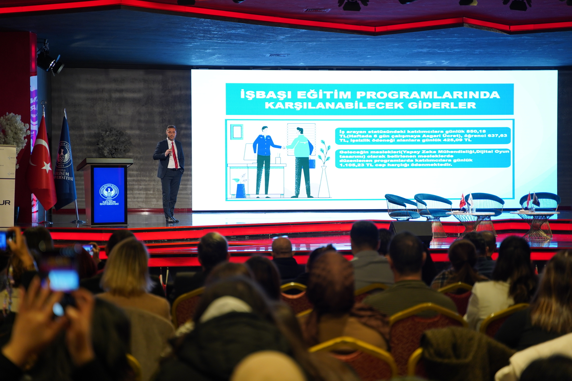 “İŞKUR, iş gücü piyasasında yalnızca iş arayanlar ile işverenleri bir araya getiren bir kurum olmanın ötesinde; bu piyasanın tüm aktörlerini paydaş olarak gören bir yapıya sahiptir. Bu paydaşların en önemlilerinden biri ise hiç şüphesiz üniversitelerdir. Bugün, İstanbul Gelişim Üniversitesi’nin ev sahipliğinde genç istihdamının özel olarak ele alınmasını oldukça kıymetli buluyoruz. Değerli katılımcılar, gençlerin istihdamını artırmaya yönelik çalışmalarımızda öne çıkan en önemli hususlardan biri, deneyim sahibi olmayan ya da yeni mezun gençlerin iş bulma sürecinde yaşadığı güçlüklerdir. Zira işverenlerin büyük çoğunluğu, deneyimli ve belirli yetkinliklere sahip bireyleri tercih etmektedir.