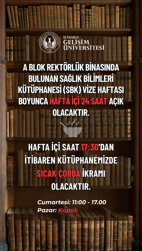İstanbul Gelişim Üniversitesi (İGÜ), vize döneminde öğrencilerin çalışma koşullarını iyileştirmek adına gelenekselleşen destek uygulamalarına devam ediyor. İGÜ A Blok Rektörlük Binası’nda bulunan Sağlık Bilimleri Kütüphanesi (SBK), vize haftasında hafta içi 24 saat boyunca açık olurken gece geç saatlerde kütüphaneyi kullanan öğrencilere 17.30’dan sabaha kadar sıcak çorba ikramı sunuluyor.